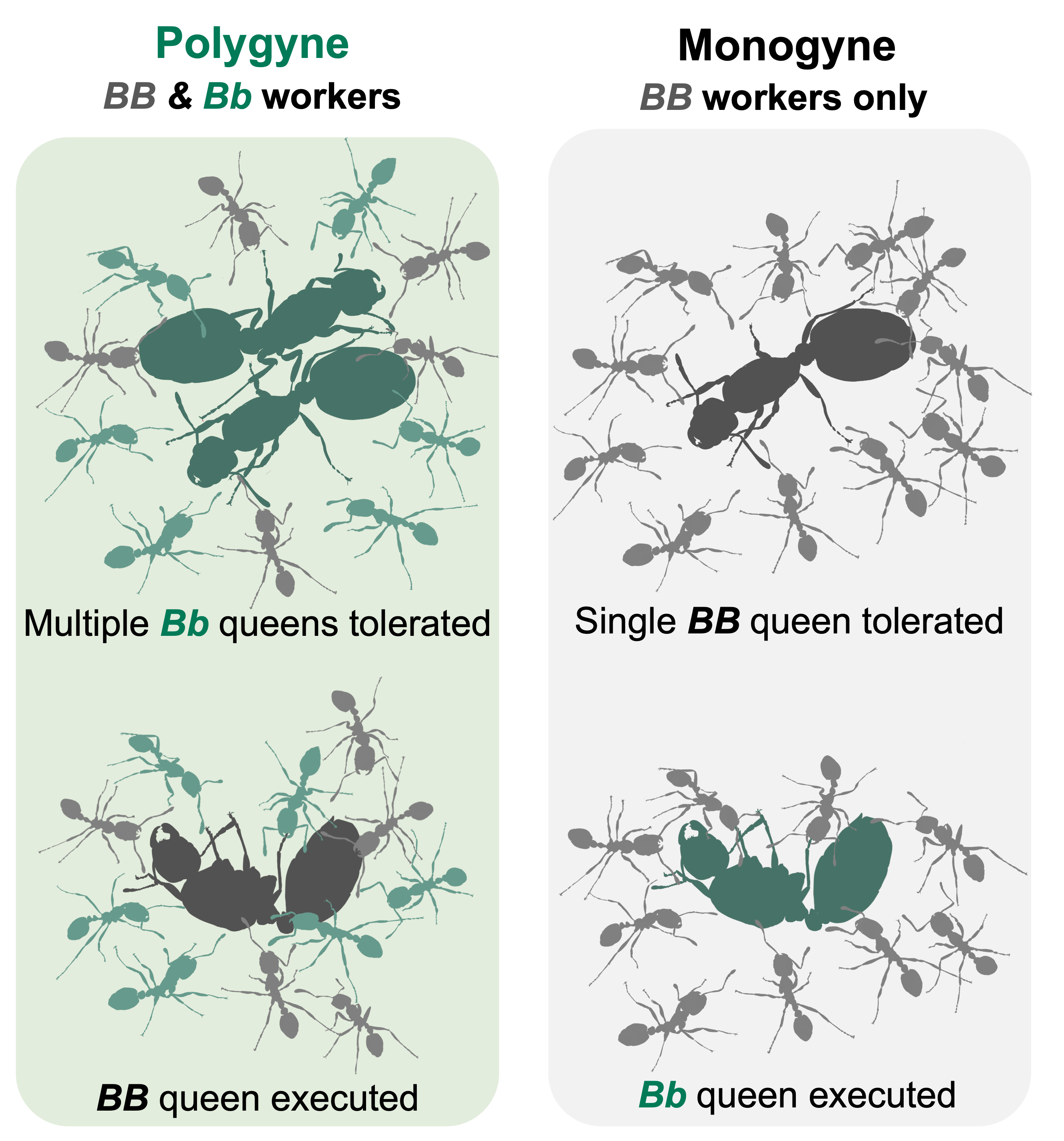 The social organization of S. invicta is controlled by the Sb supergene (hereafter as “b”). In monogyne (single-queen) colonies, queens and workers are all BB homozygotes, while polygyne (multiple-queen) colonies consist of Bb queens and a mix of BB and Bb workers. The b allele acts as a “greenbeard” element, driving Bb workers to preferentially eliminate non-greenbeard (BB) queens while accepting greenbeard (Bb) queens.