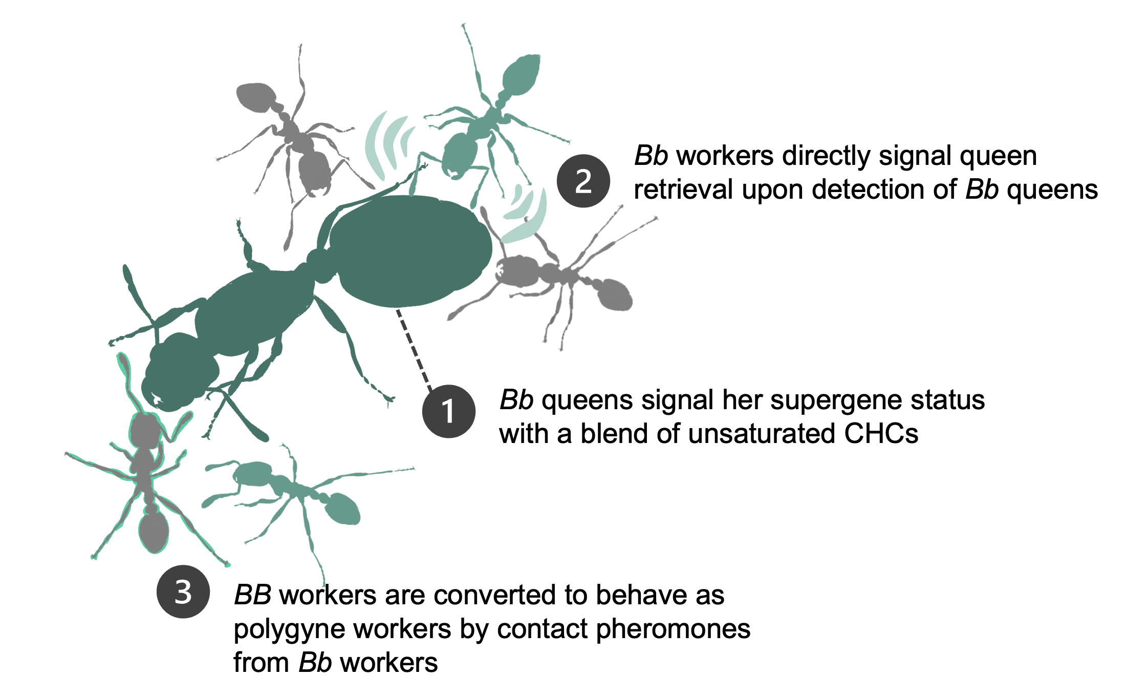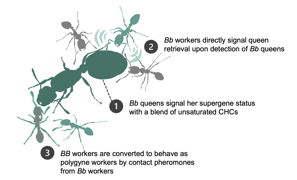 Using 400-ant microcolonies, I found that Bb workers reduce BB worker aggression toward Bb queens, enabling polygyny at rates comparable to full-size (>20,000 ants) colonies. This social conversion depends on cuticular contact and involves nonvolatile pheromones. I also identified a second pheromone, released by polygyne workers upon detecting a Bb queen, that is necessary but not sufficient for the full transition.